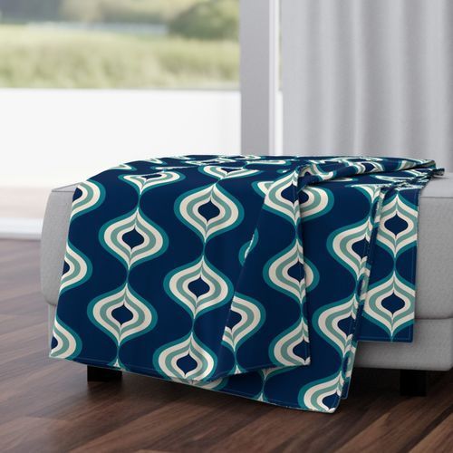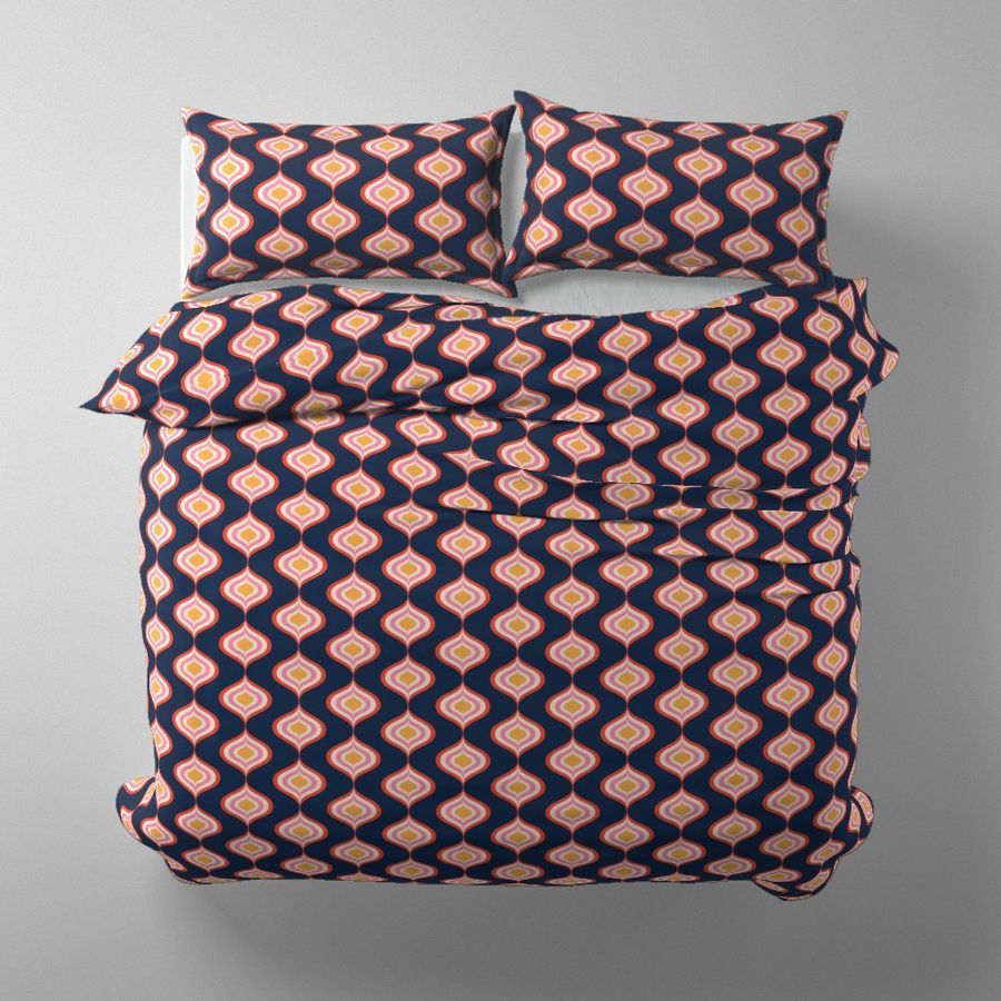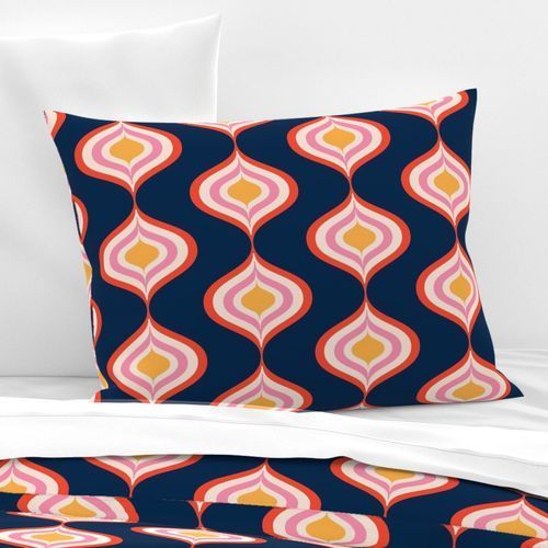 The wavy teardrop motif brings rhythm and balance - like a sun setting on repeat - and the palette (navy, coral, peach, mustard) is a nod to that golden-hour glow on a warm summer night. I wanted it to feel like a dance between structure and softness, retro and modern.